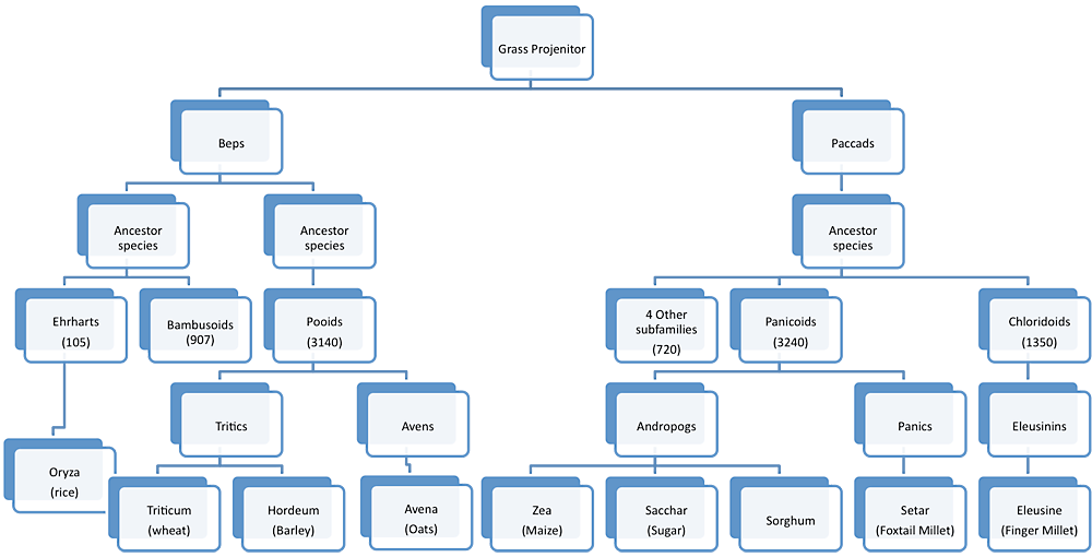 1 The opening line of the poem, "A child said, 'What is the grass?'" by Walt Whitman. It continues, "How could I answer the child? ... I do not know what it is any more than he." 2 Poaceae (also called Gramineae) is the scientific name for the grass family. As much as possible the scholarly discussion has been confined to the footnotes, while the narrative "alterative history of the world" occupies the main body of the text. 3 List of abbreviations used and liberties taken: Poaceae (grass) becomes Poac; Pooideae becomes Pooid; Panicoideae becomes Panicoid; Ehrhartoideae becomes Ehrhart; Oryza (rice) needed no reduction; Setaria (foxtail millet) becomes Setar; Andropogoneae becomes Andropog; Hordeum (Barley) needed no change; Saccharum (sugar) becomes Sacchar; Zea (maize) and Triticum (wheat) are not reduced. I hope I have taken no liberties with the nomenclature that will cause any heart attacks among agrostologists. On the other hand, I am quite certain I have caused consternation with some of the liberties I have taken in my ancestral family tree. I have massively simplified things. There has not been space to mention Centothecoideae, and more. Several of the millets have been completely ignored. I have taken other liberties too, and I can only plead for clemency, and offer the excuse that I am trying to present a massive story to a non-specialist audience in just a few words. The occasional stretching I did to emphasize the parallel with the evolution of homo sapiens is more gratuitous, but I hope the specialist with be entertained by the elevation of the Poaceae above homo sapiens. 4 One recent study has gone so far as to claim that, "The best analogy to recent human evolution may be the rapid evolution of domesticates such as maize." John Hawks, Eric T. Wang, Gregory M. Cochran, Henry C. Harpending, and Robert K. Moyzis, "Recent acceleration of human adaptive evolution." Proceedings of the National Academy of Sciences, 104, no. 52 (December 26 2007): 20753. 5 Stephen Budiansky, The Covenant of the Wild, (New York: William Morrow and Company, 1992). 6 Russell Merle Genet, Humanity. The Chimpanzees who would be Ants, (Santa Margarita CA: Collins Foundation Press, 2007). 7 Genet, 42. 8 See also Charlotte Sleigh, "Empire of the Ants. H.G. Wells and Tropical Entymology," Science as Culture 10, no. 1 (2001): 33-71. The H.G. Wells story has inspired more modern fiction, most notably Bernard Weber, Les Fourmis, (Paris: Livre de Poche, 1991); an English translation of this work has also appeared, Empire of the Ants, translated by Margaret Rocques, (London: Bantam Press, 1996). 9 H.G. Wells, "Empire of the Ants" in The Complete Short Stories of H.G. Wells, ed. John Hammond (London: Phoenix Giant, 1998):585-597. It was originally published in Strand Magazine December 1905. 10 Fredric Brown, "Come and Go Mad," in From These Ashes, ed. Ben Yalow, (Framingham MA: The NESFA Press, 2001): 320. First published in Weird Tales, ed. Dorothy McIlwraith, 1, no. 5 (July 1949). 11 A D Zinn, D Ward, K Kirkman, "Inducible Defences in Acacia Sieberiana in Response to Giraffe Browsing", African Journal of Range & Forage Science 24, no. 3 (October 2007): 123-129. 12 See for example, Ernesto Gianoli, Sebastian Sendoya, Fernando Vargas, Paula Mejia, Rodolfo Jaffe, Mayanin Rodriguez, Adrian Gutierrez, "Patterns of Azteca Ants' Defence of Cecropia Trees in a Tropical Rainforest: Support for Optimal Defence Theory," Ecological Research 23, no. 5 (September 2008): 905-908. Fabian A Michelangeli, "Ant Protection Against Herbivory in Three Species of Tococa (Melastomataceae) Occupying Different Environments" Biotropica 35, no. 2 (2003): 181-188. 13 C.J. Frost, H.M. Appel, J.E. Carlson, C.M. DeMoraes, M.C. Mescher, J.C. Schultz, "Within-plant signaling via volatiles overcomes vascular constraints on systemic signaling and primes responses against herbivores," Ecol. Lett. 10 (2007): 490–498. 14 Richard Karban, Kaori Shiojiri, "Self-recognition affects plant communication and defense," Ecology Letters 12, no. 6 (2009): 502 – 506. 15 Gregory J. Retallack, "Grassland ecosystems as a biological force in dusty dry regions," in Dust Aerosols, Loess Soils, and Global Change, ed. A.J. Busacca (Pullman WA: Washington State University College of Agriculture and Home Economics, 1998): 171-174. 16 Gregory J. Retallack, "Cenozoic Expansion of Grasslands and Climatic Cooling," The Journal of Geology 109, no. 4 (July 2001): 407-426. 17 Grass Evolution and Domestication, ed. G.P.Chapman, (Cambridge University Press: Cambridge 1992): xvii. 18 A table has been provided at the end which should assist in understanding the relationships between the various unfamiliar names. 19 Vandana Prasad,Caroline A. E. Strömberg, Habib Alimohammadian, Ashok Sahni, "Dinosaur Coprolites and the Early Evolution of Grasses and Grazers," Science 310, no.5751 (18 November 2005): 1177-1180. Evidence of grass was discovered in dinosaur feces in India, showing that grass was present before their extinction, dating early grasses to at least 65mya. This in itself is intriguing, because the movements of the continental plates meant that India was separate from the great landmasses at the time. Did grass evolve when India was still joined to Gondwanaland (which would place it even earlier, at least 80mya), or did it evolve on the Indian landmass? Who would ever have thought that a lump of dinosaur poo (euphemistically called "coprolite") would be so important to our understanding of the entire biosphere? 20 The Flagellariaceae and Restionaceae, for example. See Andrew Doust, "Architectural Evolution and Domestication in Grasses," Annals of Botany 100 (2007): 941-950. 21 In fact, these names are merely amalgams of the subfamilies that evolved out of each of the ancestor species, and these names have only appeared in scientific literature in the last decade. The BEP clade consists of three subfamilies, the Bambusoideae, Ehrhartoideae, and Pooideae; the PACCAD clad