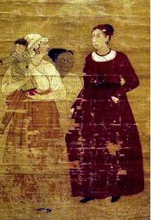 | A six meter Japanese silk screen mural (called a makimono) produced between 1840-1850 illustrates the interior of the Dutch factory at Deshima. Students can be directed to the use of skin and hair color as defining characteristics of the anonymous painter's subjects. The Dutch are stereotyped here and in other Japanese mediums as all having pure white skin; the darker figure with long hair in the center is likely a Thai servant (the Dutch long had a factory at Ayuthia in Siam), two men of possibly African descent (African slaves were not uncommon in Asia) are pushing a bale of what may be Chinese silk, while two servants are seen engaged in other activities. There are further details students can be asked to identify and explore as signifying this early phase of globalization by trade. | |||||||||||||||||||||||