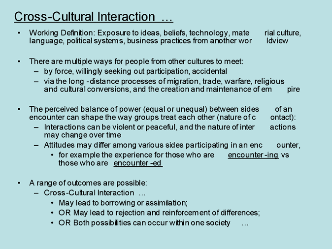 | Drawing on the past decade of scholarship in cultural encounters11 we wanted to give our students a working definition of cross-cultural interaction that would also encourage them to think about the nature of interactions, the balance of power between societies, and the range of possible outcomes which might occur. These priorities were essential if students were to realize that not all cross-cultural exchanges have positive consequences, or lasting effects. Given the length and number of concepts we were asking students to absorb, the following definition was incorporated into a series of PowerPoint slides that were shown repeatedly throughout course lectures and were posted on our Blackboard course site. Continual exposure to this definition allowed students to improve their understanding of the theme as the course progressed. | 13 | ||||||||||