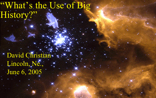 | 2) Second, I'll ask what use it is to look at the past on scales much larger than those familiar to most historians. I'll argue that the reasons for doing big history are similar to the reasons for doing world history, except on even larger scales. Like traveling away from home, big history helps us see familiar aspects of the past in unfamiliar ways. World history can do this for nationalist history (histories of particular nation states); big history can do the same thing for world history. | 4 | ||||||||||||||||||||||||||||||||||||||||||