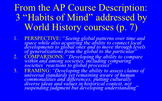 | Turning to my trusty AP World history course description, I find on p. 7 the following description of the distinctive "Habits of Mind" addressed by world history: | 14 | ||||||||||||||||||||||||||||||||||||||||||