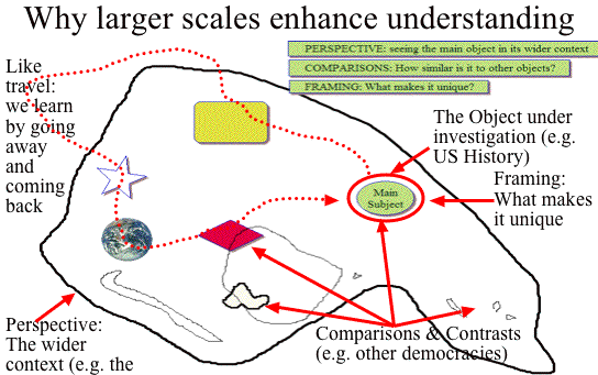 | 1) Perspective: By perspective, I mean learning about something by seeing it in its context. This means seeing the larger community or entity of which it is a part. By placing something in perspective, you learn that it does not exist by itself, but is integrated in various ways in to other, larger entities. Perspective can give a sense of realism. It can help American students learn that the USA is part of a wider world and the future of the USA is inextricably bound up in various ways with the future of that wider world. They can also learn the extent to which their own society is made up of immigrants from that wider world so that its culture is woven from many strands, most of which come from elsewhere. | 16 | ||||||||||||||||||||||||||||||||||||||||||