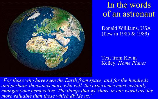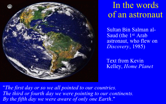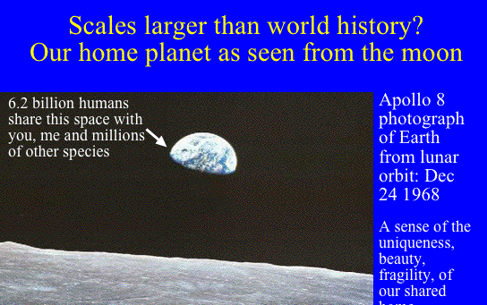 | A Sense of Perspective: Is there any point in looking at human history from scales larger than those of the world? The first hint that there may be something to learn comes from the wonderful photographs of the earth from space that appeared in the 1960s as the first humans traveled in space. Astronauts and cosmonauts were uniformly moved by those pictures, as were many other people. What they did was to show that our world is very beautiful, but also rather isolated and fragile. They also created a vivid sense of the earth as our common home, and one that we share with many other species. Kevin Kelley's wonderful Our Home Planet combines photographs from space with interviews from astronauts. | 23 | ||||||||||||||||||||||||||||||||||||||||||