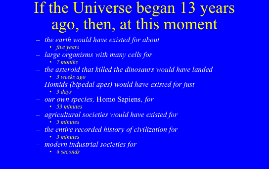 Fundamental Dates: Here are some of the fundamental dates. If we imagine that the Universe was created just 13.7 years ago (instead of 13.7 billion years ago), then: