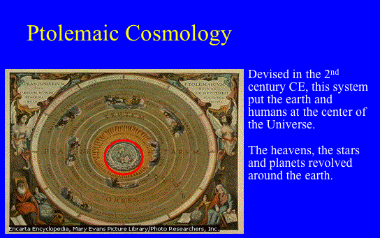 | The place of humanity in other cosmologies: It's worth noting that this perspective is different from that of most pre-modern ways of looking at our place in the universe. For example, the Ptolemaic model of the universe, which dominated thought in medieval Europe put the earth at the centre of the universe, and put humans at the centre of the earth. In this cosmology there could be no doubting the importance of humans. | 27 | ||||||||||||||||||||||||||||||||||||||||||