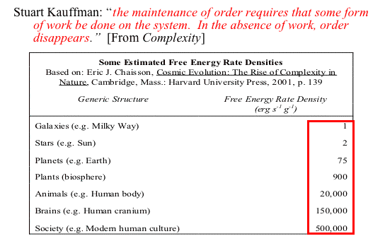 | The fact that making complex things requires a flow of energy suggests that, even if we're not sure what complexity is, perhaps we can rank different things by their degree of complexity. This is what the astronomer, Eric Chaisson, has suggested in his book, Cosmic Evolution. His idea is that the more complex an entity is, the greater the energy flows that ought to be needed to maintain it. So energy flows provide a rough way of ranking entities by their level of complexity. Here are his calculations. | 31 | ||||||||||||||||||||||||||||||||||||||||||