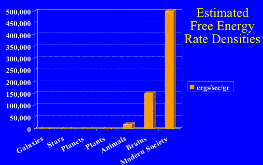 The unit he uses describes the amount of energy (in ergs) that flows through a given mass (in grams) in a given time (in seconds). Using this unit, and some back-of-the-envelope calculations, he concludes that, the "free energy rate density" (the flow of energy) of different entities is as follows [Cosmic Evolution, p. 139]: