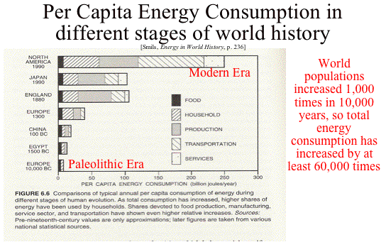 | Increasing complexity and control of energy in human history. In fact, we can see the build up of that complexity in the course of human history, by looking at how humans have increased their capacity to control energy flows at the surface of the earth. Indeed, the ways humans have done this must surely count as one of the dominant shaping forces in world history. While Paleolithic societies seem to have mobilized about 5,000 Calories per person per day, early agrarian societies probably mobilized about 12 C., more advanced agricultural societies mobilized about 26 C., early industrial societies about 77 C., and modern industrial societies can mobilize about 230 C. As human populations have multiplied by at least 1,000 times in the last 10,000 years, this means that the total amount of energy mobilized by our species as a whole has increased by a factor of almost 50,000 times. | 35 | ||||||||||||||||||||||||||||||||||||||||||