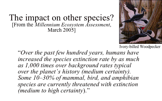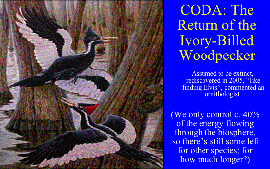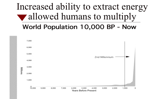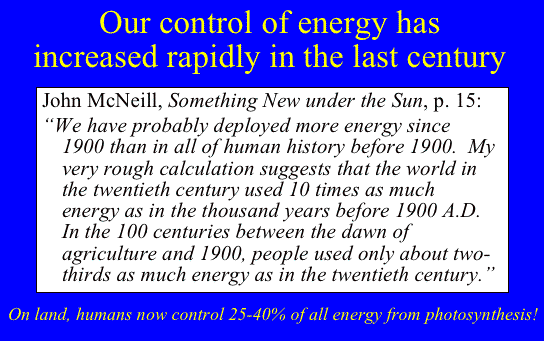 | Increasing control of energy shows up in the very earliest phases of human history, in the migrations that allowed humans to settle all parts of the world by learning how to extract energy and resources from many different types of environment. Eventually, increasing control of energy allowed human populations to increase, and as they increased their interrelations became more complex. This was particularly apparent when humans first began to practice agriculture from about 10,000 years ago. This sudden increase in the ability of humans to divert energy to their own uses led to accelerated population growth, which eventually led to the appearance of the larger concentrations of humans we describe as cities. Within cities, social relations became vastly more complex than they had been in the smaller and simpler societies of the Paleolithic era. Then, in the modern era, there was another sharp acceleration in human control of energy. This was associated with what is often called the "Fossil Fuels Revolution". By some estimates, humans now control between 25% and 40% of all the energy that enters the biosphere through photosynthesis. Clearly, if one species controls this much energy, other species may feel the pinch. And indeed they do. Extinction rates of other species are currently as high as they have been during the 5 or 6 periods of most rapid extinctions during the last billion years. | 36 | ||||||||||||||||||||||||||||||||||||||||||
