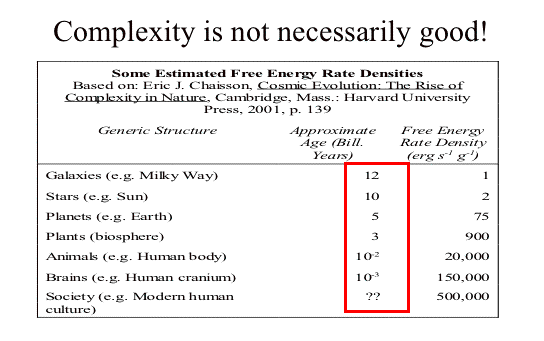 | But complexity is not necessarily good! But this is not quite the end of this line of argument. Magnificent we may be, but we're also fragile. Complexity is not necessarily good! Chaisson's original table has a column that I removed the first time around. It estimates the life-expectancy of different entities at different levels of complexity. And the pay-off is pretty clear. As one would expect, the more complex a thing is, the harder it is to make, the rarer it is and the shorter its normal life span. Neither we as individuals, nor the astonishingly complex societies we belong to will last as long as much simpler entities such as the earth or the sun. Complexity is not necessarily good or progressive. It's just . . . complexity. | 39 | ||||||||||||||||||||||||||||||||||||||||||