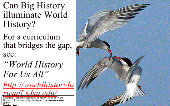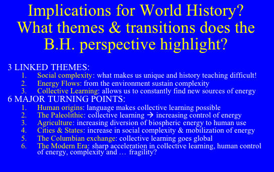 | 4) Finally, I'll return to the scales of world history and ask how the big history perspective may change our view of the central themes and turning points of world history. I'll list some of the themes that seem to me to stand out most clearly when we look at world history within the large scales of big history, and I'll list what seem to me the crucial turning points in world history. I'll end by offering some uninvited suggestions about the AP World History syllabus that arise out of this discussion. | 6 | ||||||||||||||||||||||||||||||||||||||||||